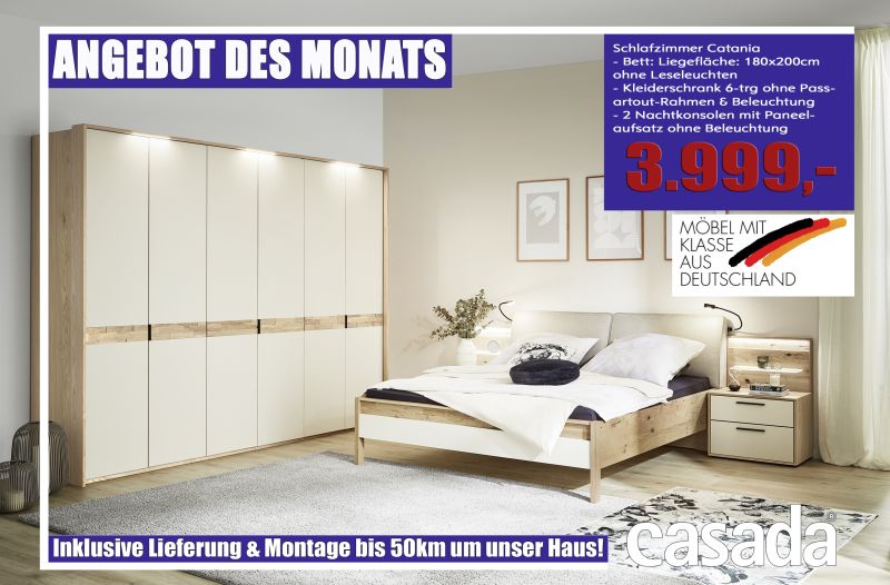 Schlafzimmer Balkeneiche echtholzfurniert / Lack matt sand diesen Monat Schlafzimmer bestehend aus: Bett mit Liegefläche: 180x200cm ohne Leseleuchten, Kleiderschrank 6-trg ohne Passpartout-Rahmen & Beleuchtung, 2 Nachtkonsolen mit Paneelaufsatz ohne Beleuchtung nur 3.999,- inklusive Lieferung & Montage bis 50km um unser Haus!