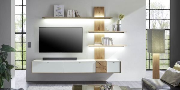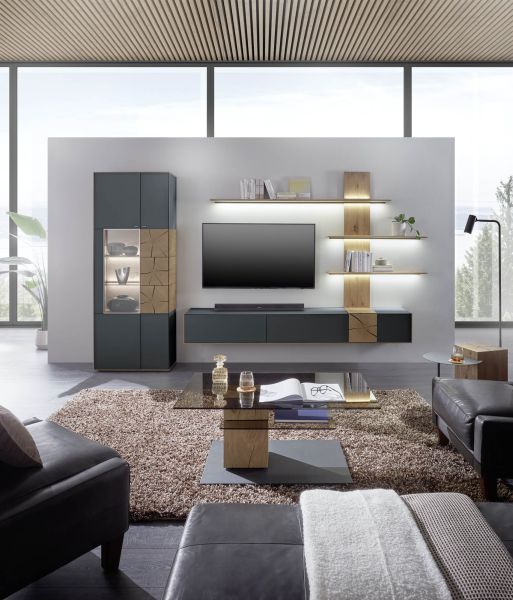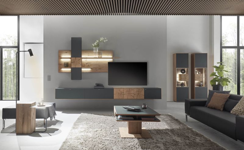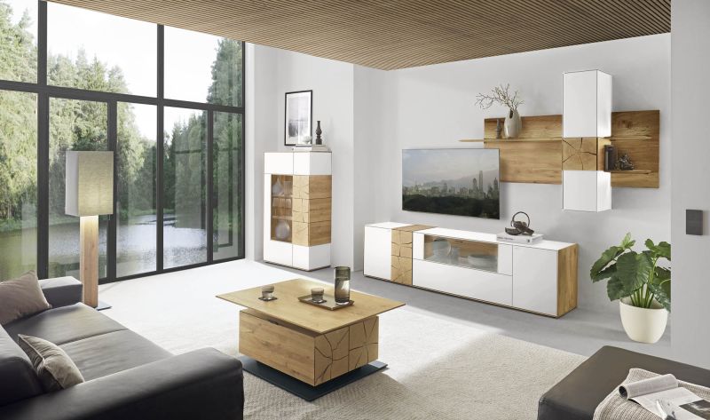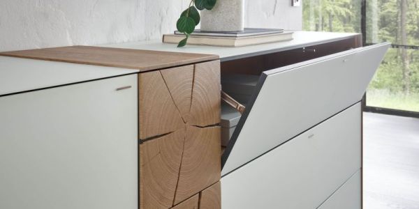 Die Rinde verleiht dem Programm einen einzigartigen, natürlichen Look und sorgt somit für eine angenehme, ruhige Wohnatmosphäre. Das verarbeitete Massivholz Kerneiche Natur weist typische Merkmale wie Kernrisse und Flügeläste auf und unterstreicht somit den wilden, rauen Charakter der Linie. In Kombination mit kühlem Metall schafft es stilistisch eine überaus spannende Dramaturgie.