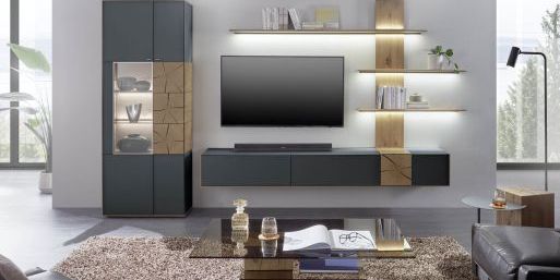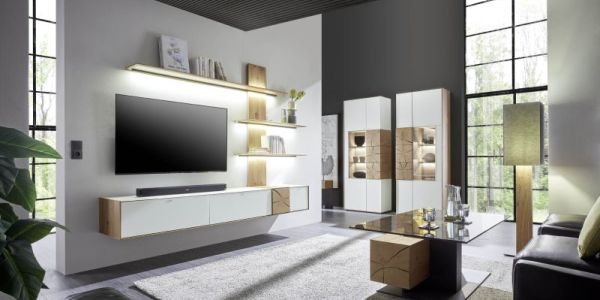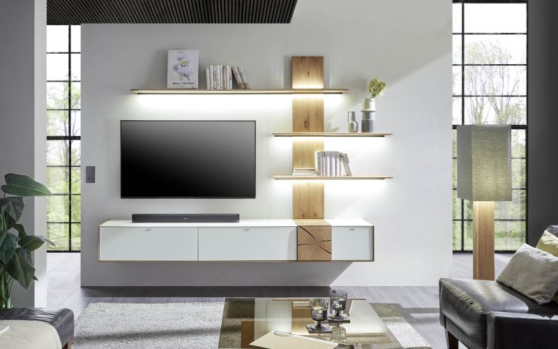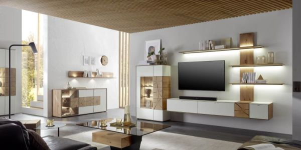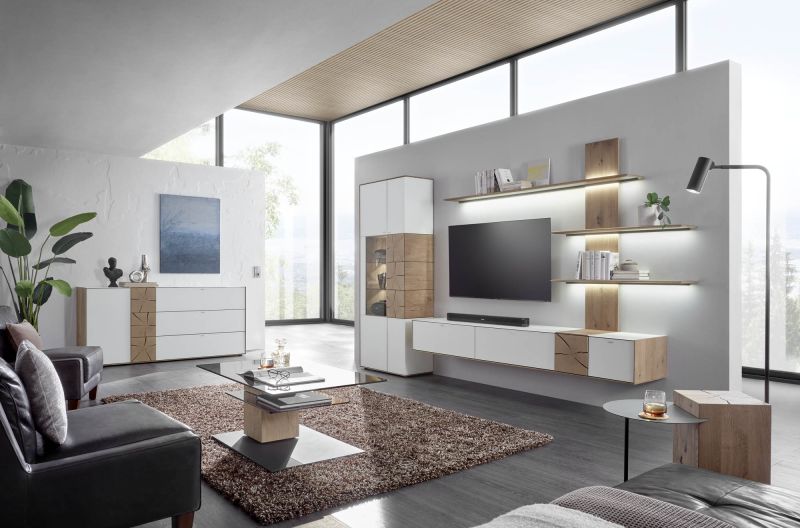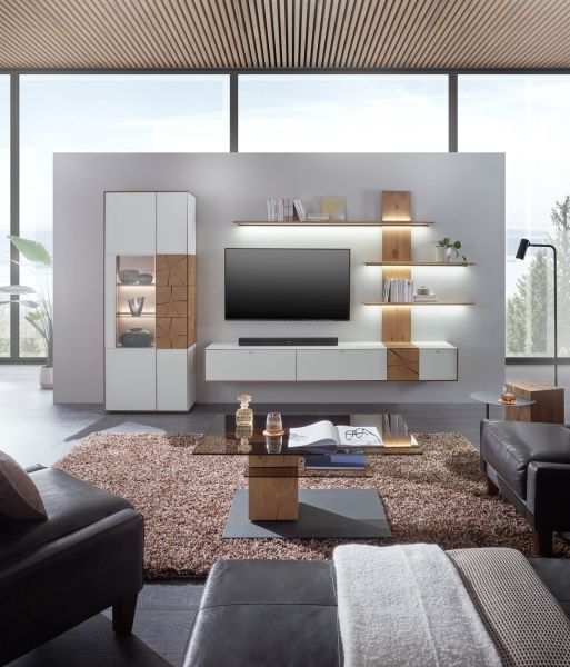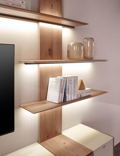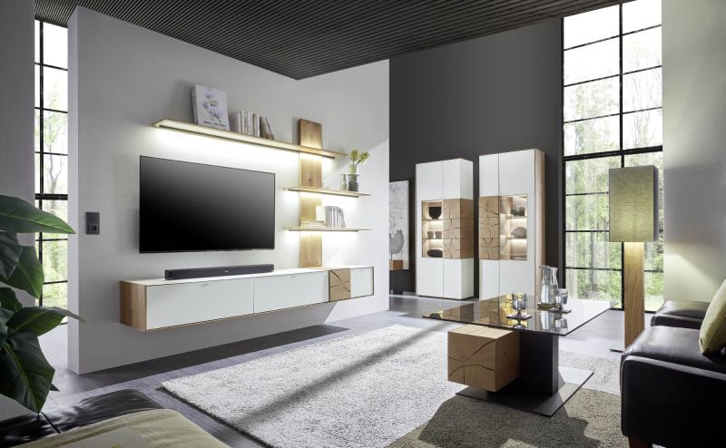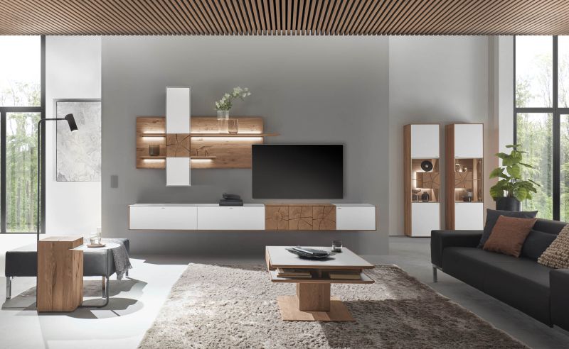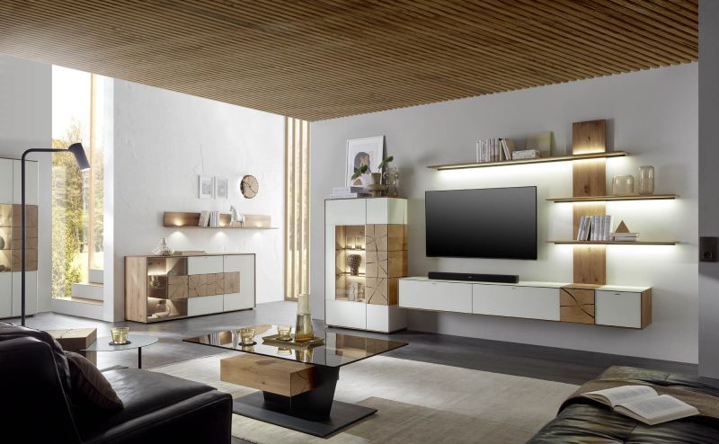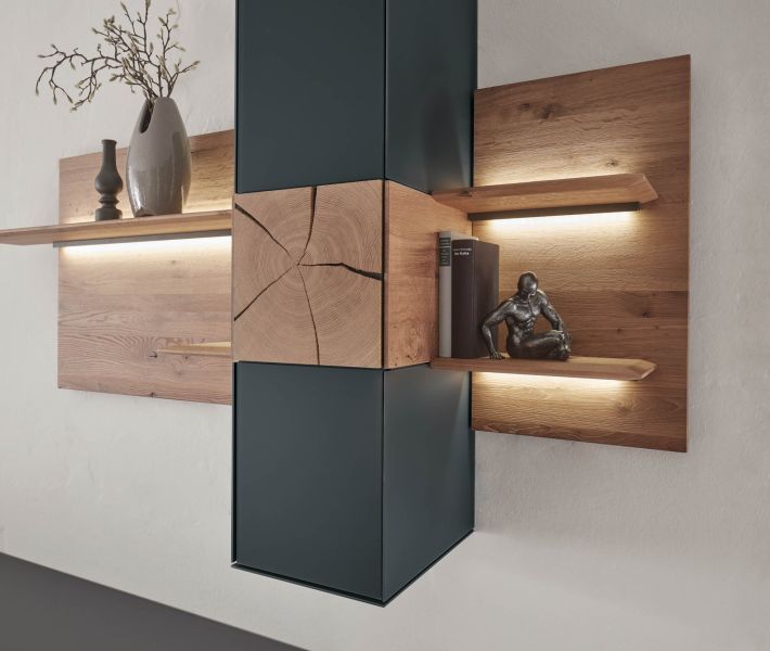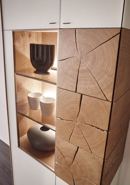 Neben massiv gebürsteter Kerneiche und matten Glas-Elementen in Weiß und Anthrazit, stehen individuelle Hirnholzscheiben im Mittelpunkt.