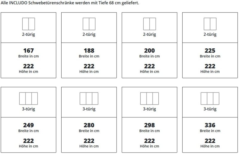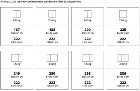 - acht verschiedene Breiten von 167cm bis 336cm Höhe immer 222cm